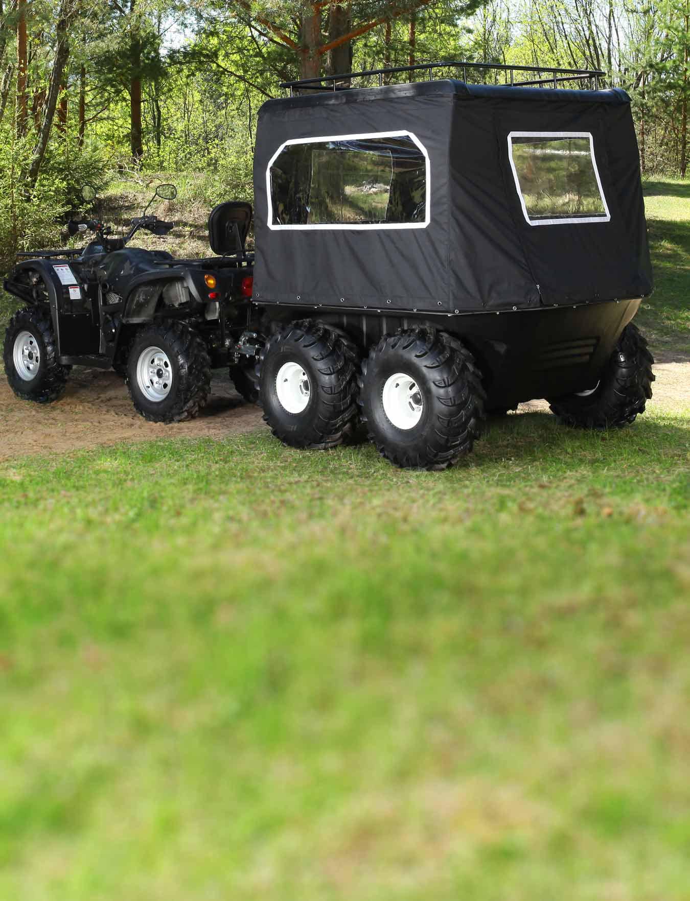 За счет больших тракторных колес, квадроцикл может легко преодолевать глубокие грязные канавы, заснеженные тропы и водную гладь. При этом водитель в любых условиях полностью контролирует машину, удерживая ее равновесие, не давая перевернуться.