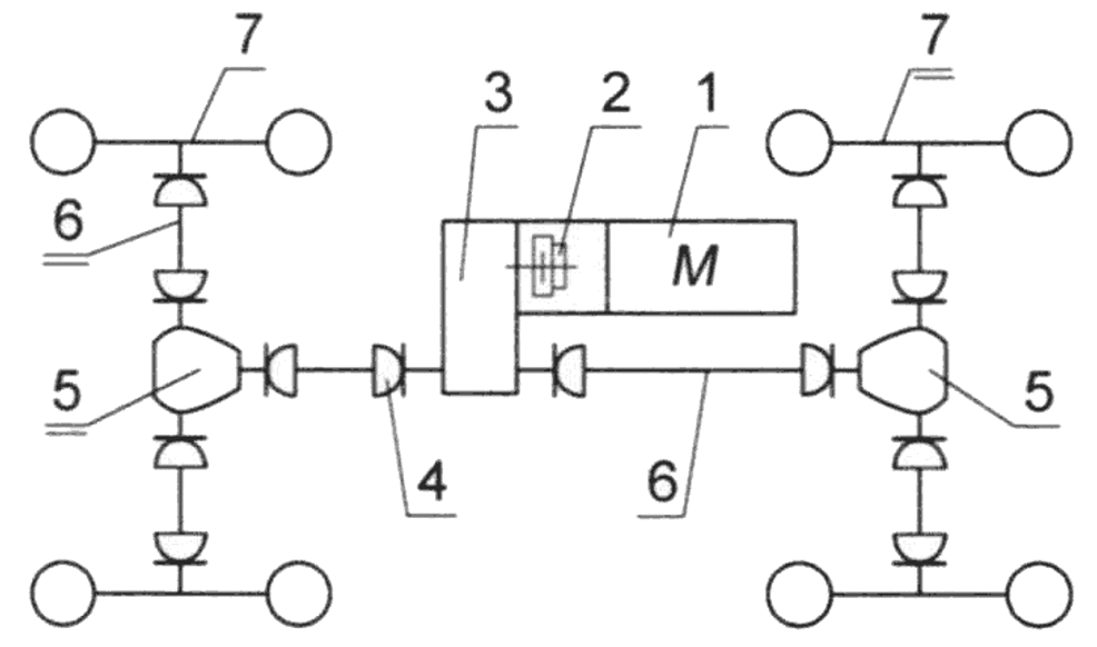 Схема трансмиссии квадроцикла 4х4: 1 — двигатель “Ока” 0,75 л; 2 – сцепление; 3 – МКП с “заниженной” главной парой; 4 – трансмиссионный вал (Шрусы ВАЗ-2108) до переднего моста; 5 – редукторы ведущих мостов (ВАЗ-2101); 6 – трансмиссионный вал. 7 – колеса.
