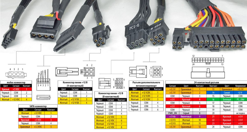 Для вашего удобства я подобрал ряд картинок с распиновкой всех типов разъемов блока питания на сегодняшний день.
