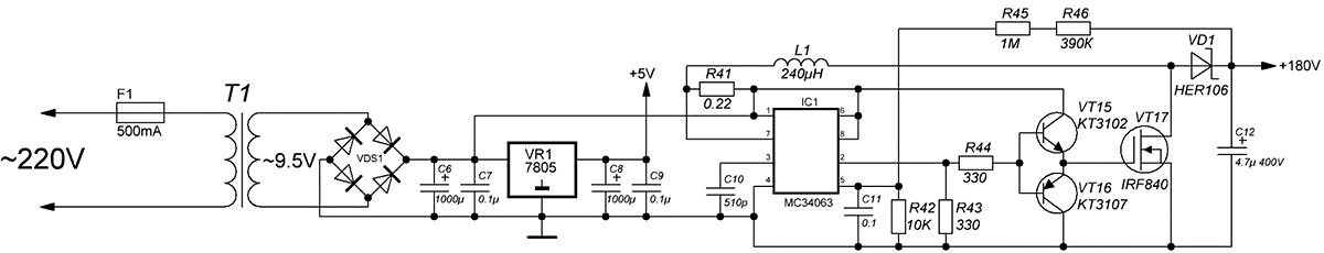Вариант с трансформатором, на вторичной обмотке которого будет 170 или 180 В, исключаем сразу по причине больших габаритов и веса. Подбирать железо, провода и мотать самостоятельно – дело неблагодарное и утомительное. Практичнее применить преобразователь напряжения на микросхеме MC34063, имеющий малые габариты, вес и стабильные параметры.