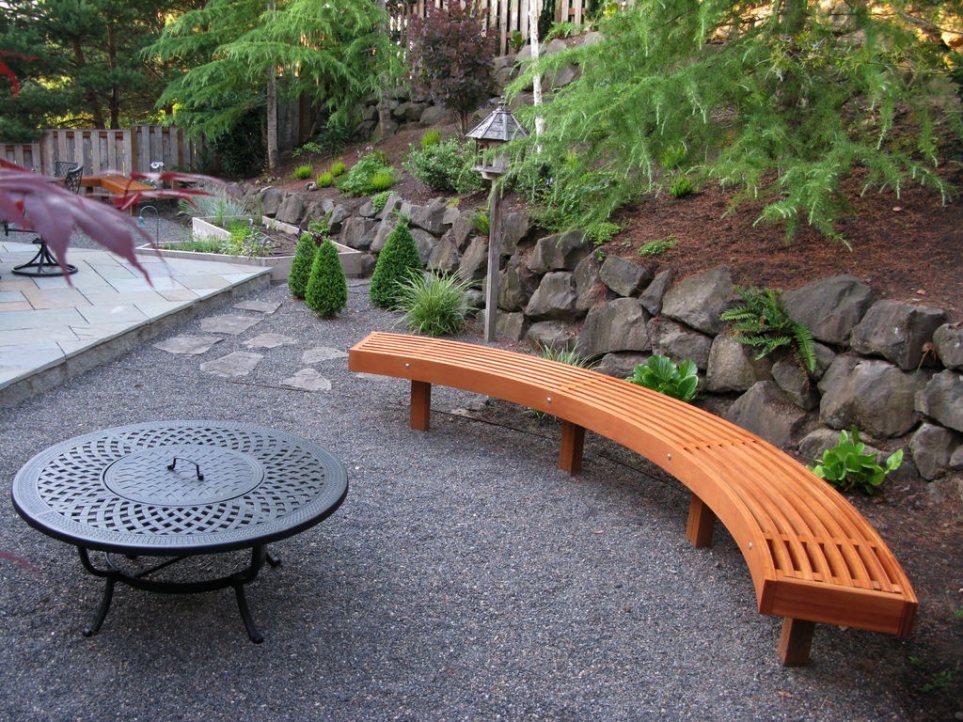 Очень эффектно будет смотреться камень с древесиной. Главные материалы в саду шикарно выглядят в грубых скамейках и каменных статуях.