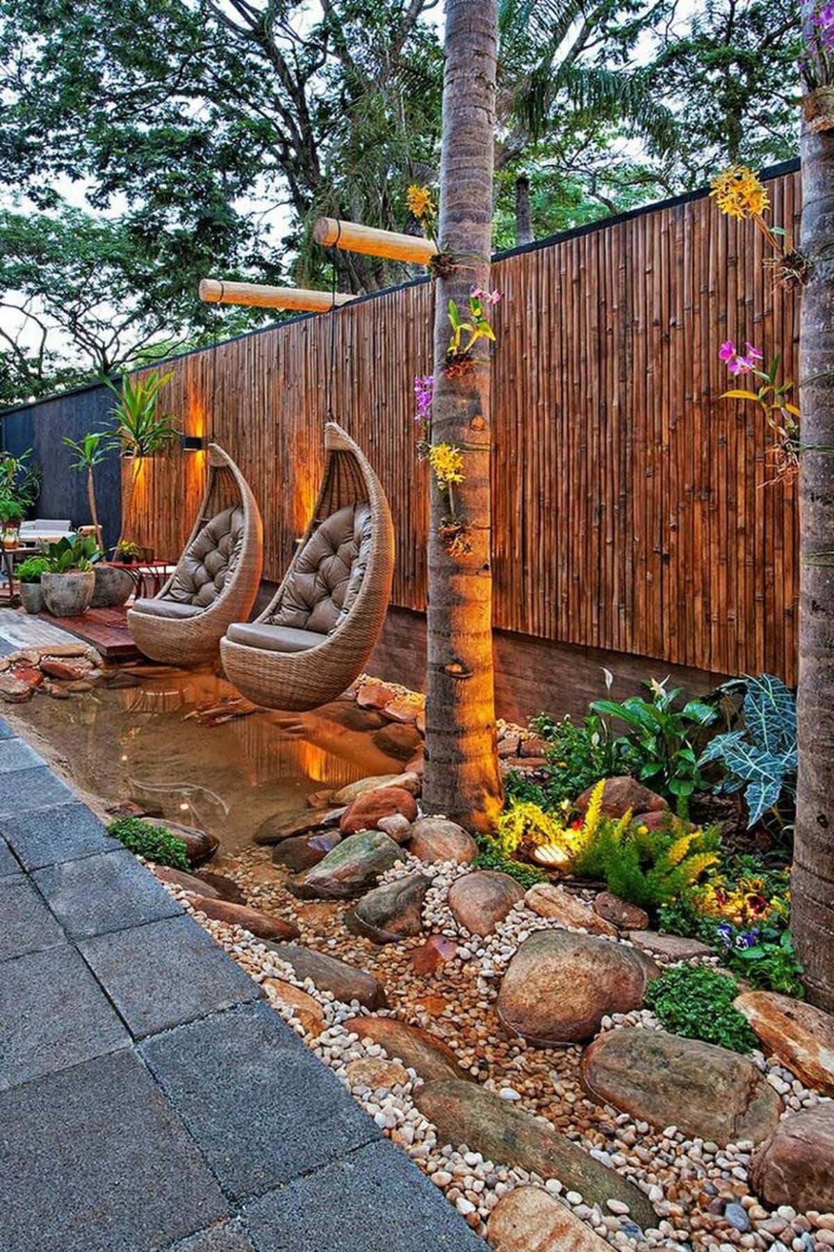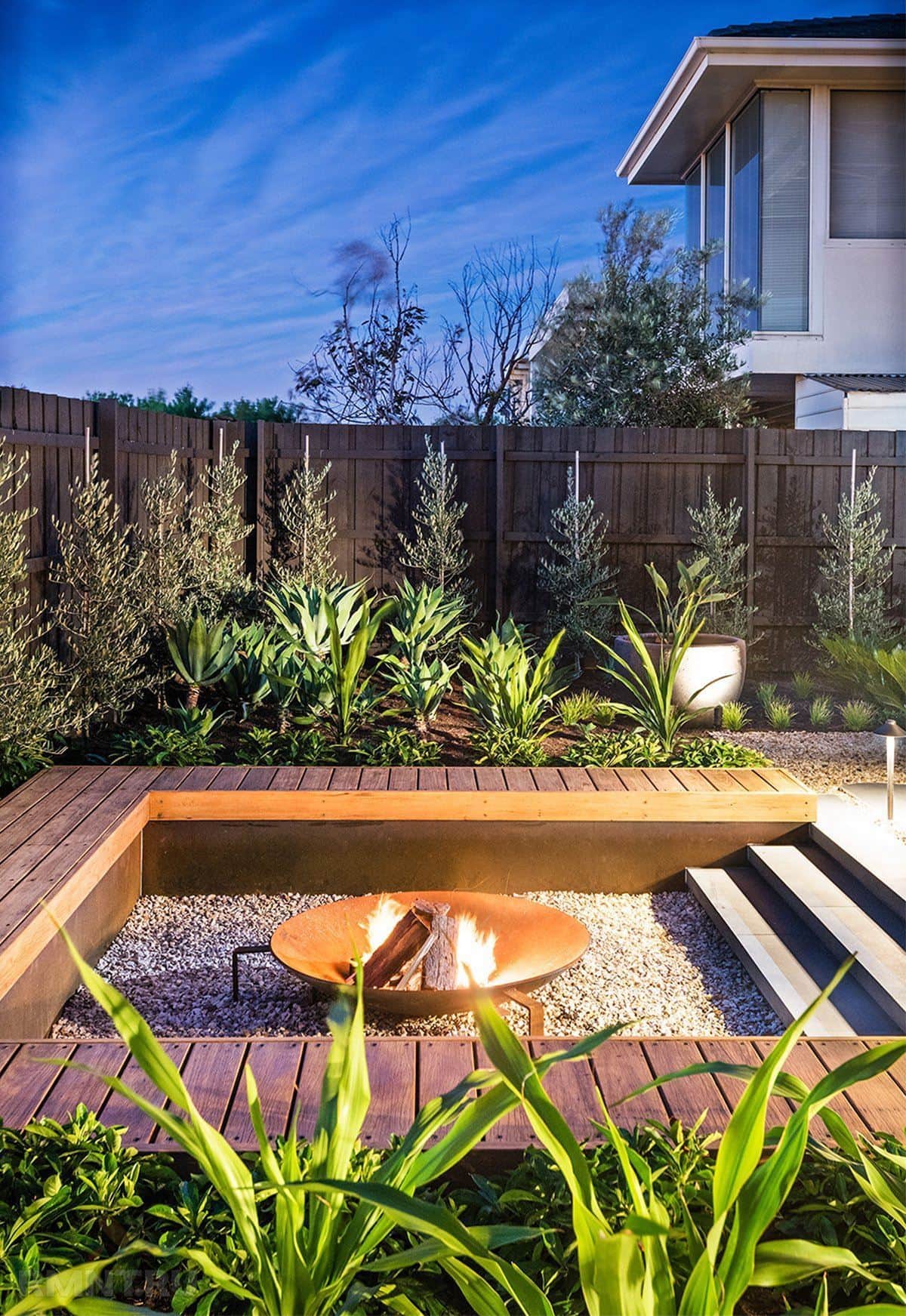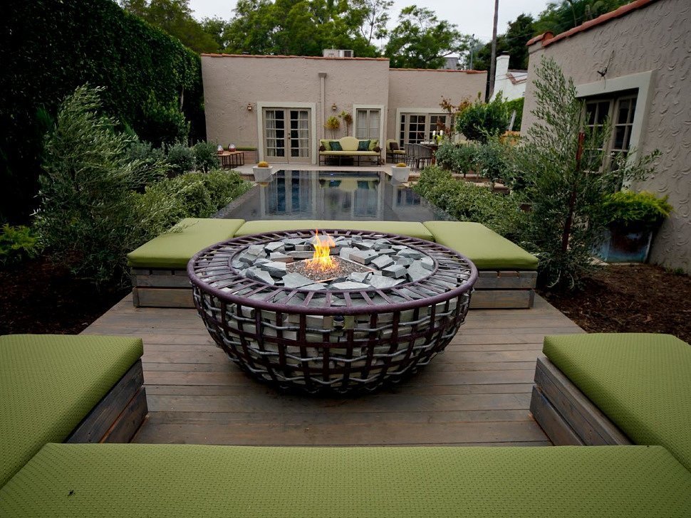 Еще одно интересное решение – огонь и вода. Новой смелой тенденцией ландшафтного дизайна становится сочетание во дворе двух стихий: воды и огня. С их помощью получают фокусные точки, а двор становится эксклюзивным и очень интересным.