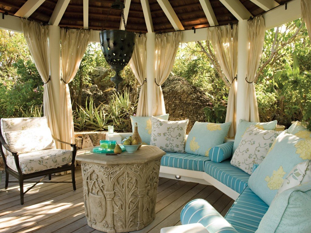 Для садов большей площади используйте закрытую беседку, которая создаст не только укрытие от солнца, но и будет барьером для ветра на более открытых пространствах.