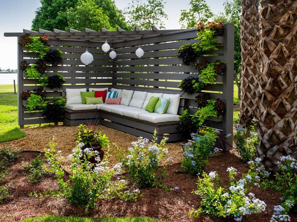 Привнести нотку позитива в обстановку заднего дворика можно необычным декором забора. Вам останется лишь подобрать в цвет к нему текстиль и подушки на мебель, чтобы патио стало привлекать гармоничностью внешнего вида.