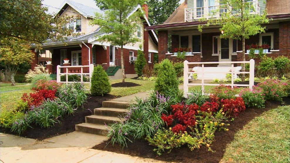 Необычное исполнение клумб на переднем дворе дома
