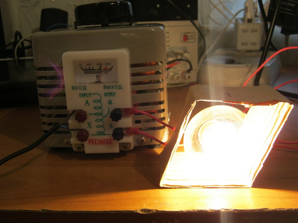 Интересно, при каком напряжении начнет светится спираль лампочки? Давайте узнаем! Крутим регулятор, пока не заметим слабое свечение лампочки.