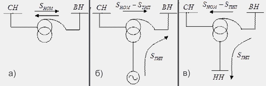 - В комбинированном режиме (b) можно передавать мощность, не превышающую тип S, из сети низкого напряжения в сеть высокого напряжения и одновременно (Snom Stype) из сети среднего напряжения в сеть высокого напряжения. Этот режим допустим и экономичен, так как нагрузка общей обмотки может быть в пределе равной 0 и Snom в сумме передается через АТ.