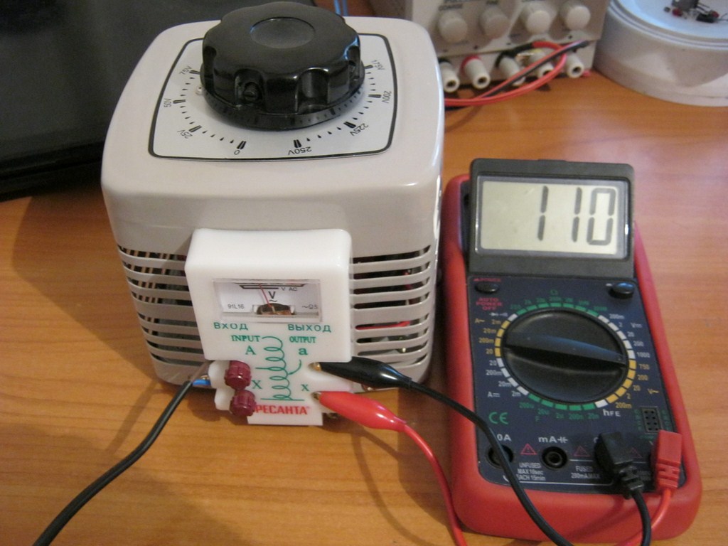 Цепляемся и меряем переменное напряжение. Заодно подгоняем с помощью регулятора ЛАТРа. Ровно 110 Вольт!