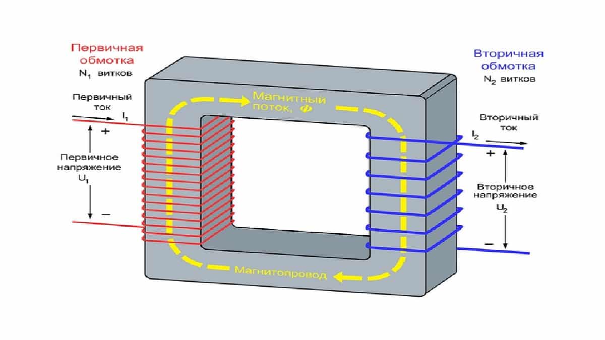 Рис. 1: принципиальная схема трансформатора Наиболее сложный вариант, если вы будете изготавливать трансформатор своими руками с нуля. В таком случае расчет электрической машины производится в зависимости от выходной мощности. Исходя из этого параметра, рассчитывается мощность первичной обмотки. Если вы используете заводской сердечник, то можно считать эти величины одинаковыми, если вы соберете его самостоятельно, то P2 = 0,9 * P1