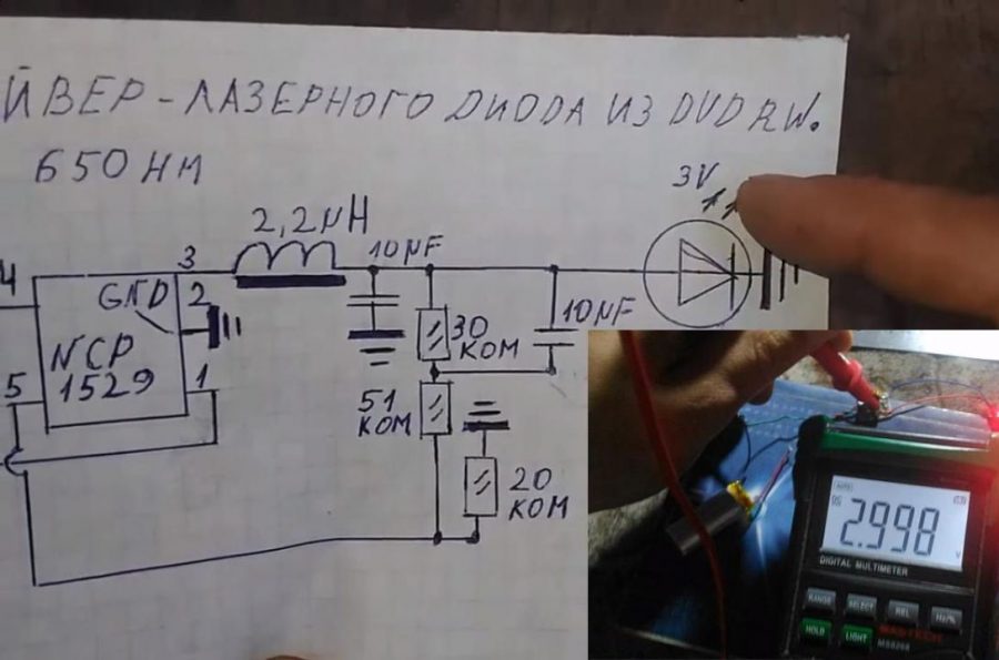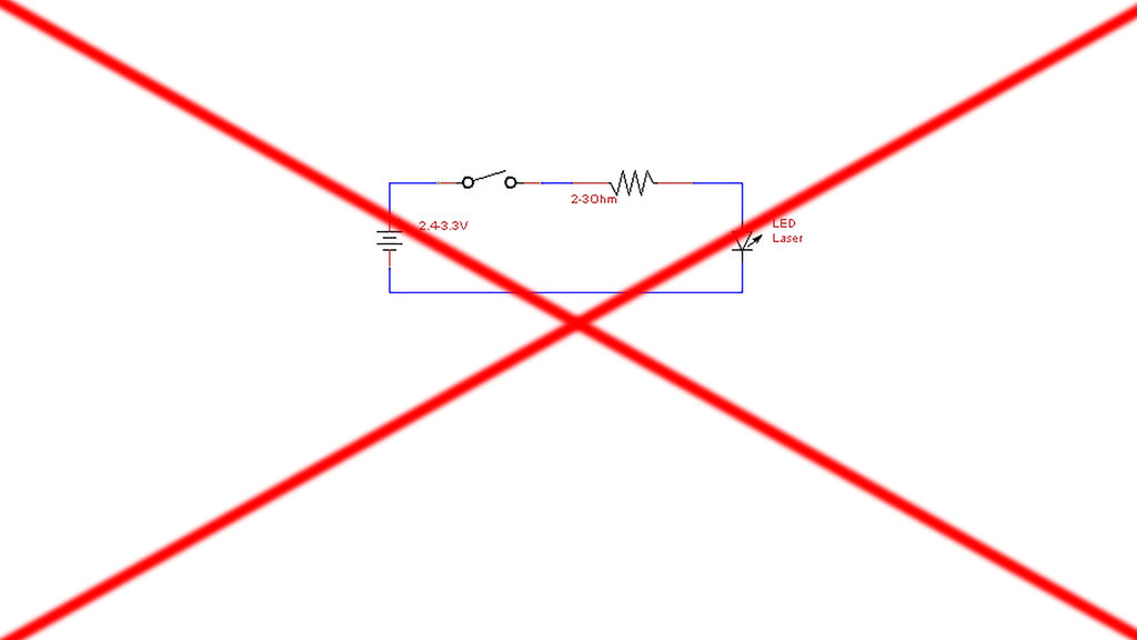 Следующий шаг — ограничитель тока (драйвер). К сожалению, не получится просто соединить диод батарейкой — он сразу же сгорит. Поэтому нам нужно собрать простую схему. Если, прежде чем посмотреть моё видео, вы уже гуглили что-то о том как сделать лазер из дисковода, то, вероятно, видели одну простую схему. Я не рекомендую так делать, так как эта схема 100% убьёт ваш диод, это всего лишь вопрос времени.