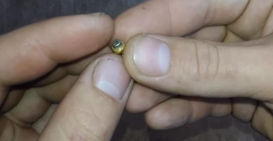 Для начала разбираем лазерный модуль, добираемся до инфракрасной головки. Для этого раскручиваем болты корпуса. Достаем головку лазера. Теперь главная задача — добыть лазерный модуль без разрушения. Модуль боится статического напряжения и моментально выходит из строя. Чтобы этого избежать, возьмем приготовленную жилу провода, обматываем все ножки, закоротим друг с другом. Теперь статика не опасна.