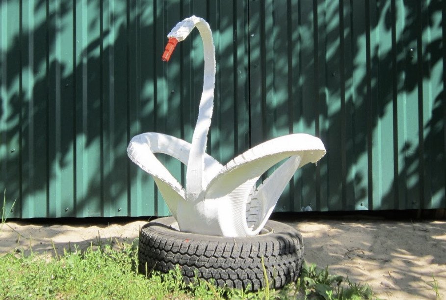 Для первого лебедя из покрышек на дачном участке можно соорудить подружку из еще одного ненужного материала. Перед таким декором не устоит никто. А время, потраченное на работу, окупиться позитивными эмоциями друзей и близких сполна.