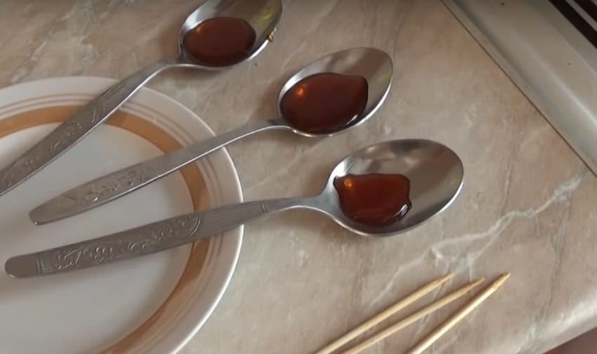Когда сироп хорошо загустеет, берут немного массы в чайную ложечку и опускают в воду. Если остывшая масса сильно прилипает к зубам, значит, её ещё нужно немного уваривать, если карамель грызётся, то продукт считается готовым.