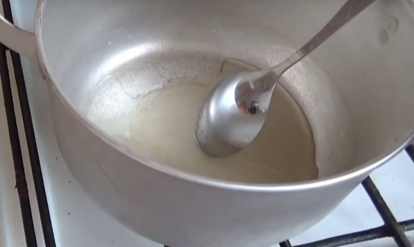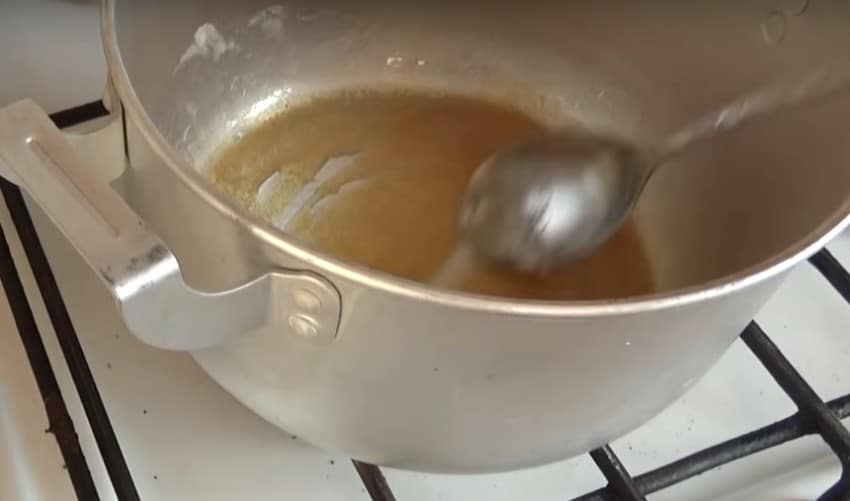 - Смесь нагревают до 130 градусов, редко перемешивая. При нагревании до нужной температуры масса темнеет. В этот момент посуду снимают с плиты.