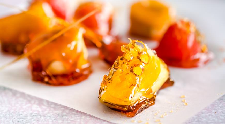 Из ливной карамели в домашних условиях нетрудно выполнить «петушков» и «зайчиков» на палочках, имея соответствующие формы. Вы можете привести в восторг гостей, покрыв карамелью кусочки фруктов и ягоды.