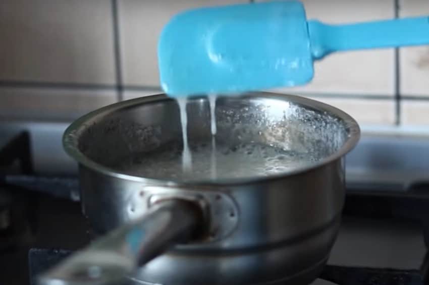 - Затем кастрюлю сразу пора ставить на средний огонь до полного растворения ингредиентов. Когда смесь закипит, нужно добавлять в нее краситель и размешивать до равномерного распределения.