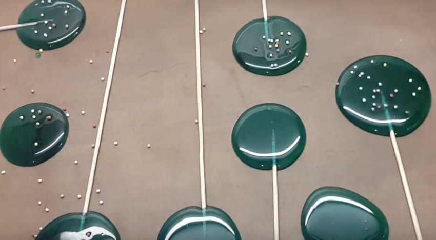5. Длинные палочки или зубочистки опустите в каждую карамельную лужицу, пока она ещё жидкая и горячая, и немного прокрутите. Еще не застывшие леденцы можно декорировать цветной посыпкой.