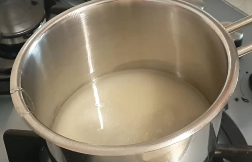 - Молоко отправляется в толстостенный сотейник, ставится на небольшой огонь и доводится до кипения.