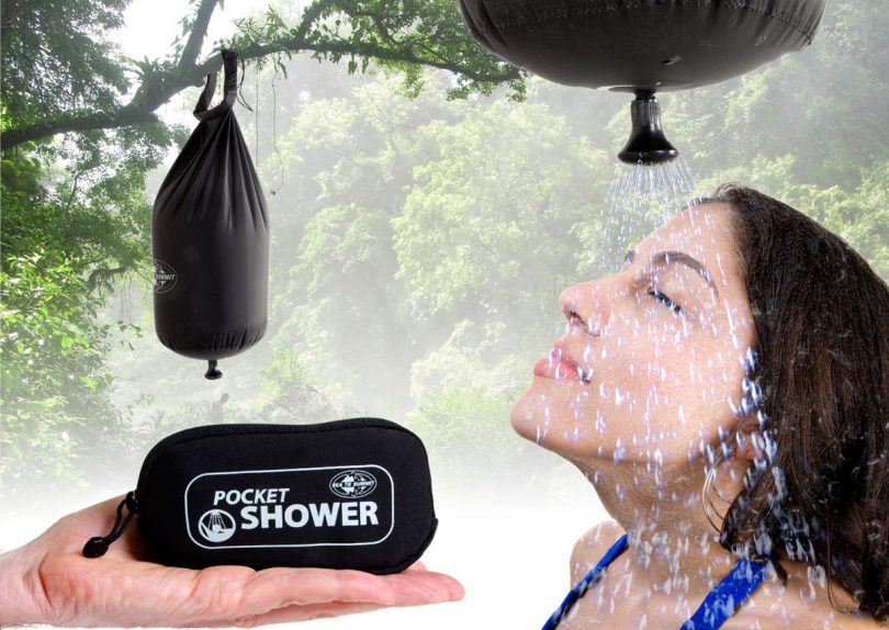 Переносной душ в кейсе. Видов такого душа может быть множество. А вот суть остается такая же везде – объем воды максимум для двоих, проблемы с подогревом воды. Но и сливная яма не нужна этому душу – с парой десятков литров грязной воды экология точно справиться.