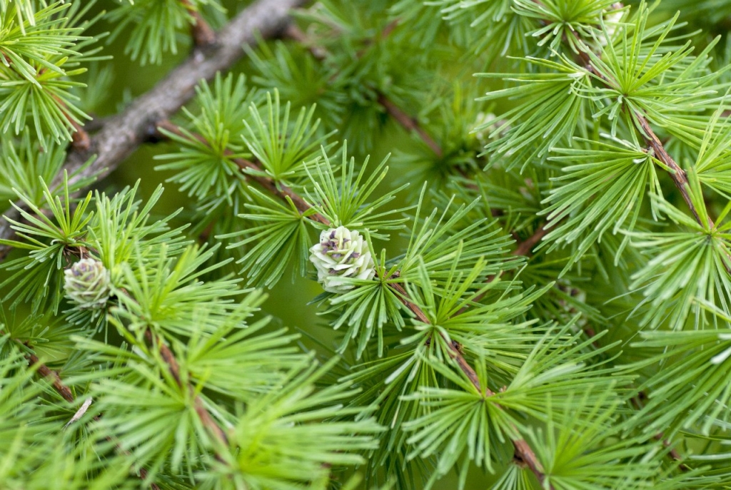 - Лиственница американская (Larix laricina) наибольшее распространение имеет в северном полушарии планеты и по высоте обладает параметрами до 25 метров. Поперечник ствола может колебаться в пределах 30–60 см. В основном эта разновидность расселена на территории Канады и северо-востоке США. Крона приобретает конусовидные очертания благодаря змееподобным ветвям, которые декоративно повисают к поверхности почвы. Окрас ствола темно-бурый или сероватый. Хвоя этой разновидности в весенний период светло-зеленая, а к лету становится насыщенного темно-зеленого колера. Листья-хвоинки в длину достигают 3 см. Параметры шишек составляют 10–20 мм, оттенок их фиолетовый, пока они не созреют и высохнут. После того, как шишка откроется, ее цвет станет коричневым. Процесс цветения приходится на начало майских дней, а результативное вызревание плодов-шишек имеет место четыре раза в году. Рост этого сорта хвойника более медленный, чем других разновидностей лиственницы.