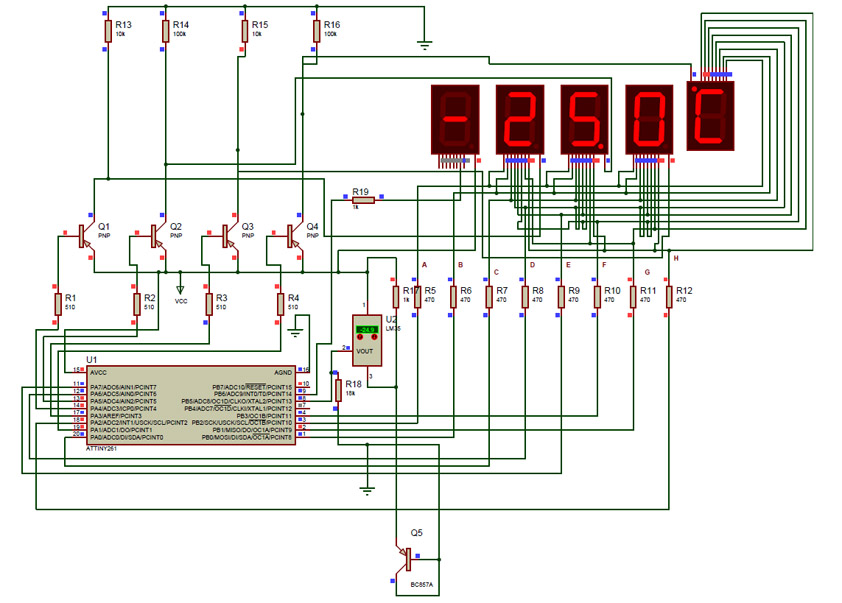 Исходный код программы (для CodeVision AVR v1.25.9 и ниже), схема термометра и проект для Proteus находятся в файле Digital_thermometer_with_LM35.rar.