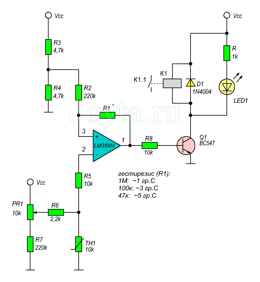 Стоит еще обратить внимание на резистор, обозначенный на схеме как R6. Его отсутствие приведет к некорректной работе терморегулятора при высоких температурах — термистор под влиянием увеличения температуры уменьшает свое сопротивление, что в крайних случаях (при высокой температуре) может привести к снижению сопротивления до такого значения, что ток, протекающий через термистор, начинает его нагревать, а это приведет к бесконечным переключениям реле