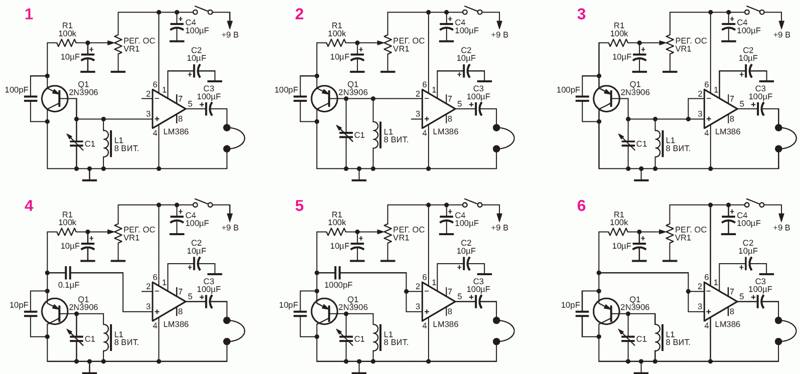 На схемах 1, 2 и 3 входы LM386 подключены непосредственно к контуру, а сам LM386 используется как радиочастотный детектор огибающей. В схеме 4 с относительно большой емкостью конденсатора связи LM386 используется одновременно как аудиоусилитель и детектор огибающей, где оба сигнала оказываются на эмиттере входного транзистора. В схеме 5 емкость входного конденсатора связи меньше, а LM386 работает детектором огибающей, который только детектирует радиочастотный сигнал, поступающий с эмиттера входного транзистора. Схема 6 работает как детектор огибающей и не имеет входного конденсатора связи; оба дифференциальных входа LM386 соединены с эмиттером. Это защищает LM386 от насыщения входным постоянным напряжением (порядка 0.6 В) с эмиттера транзистора.