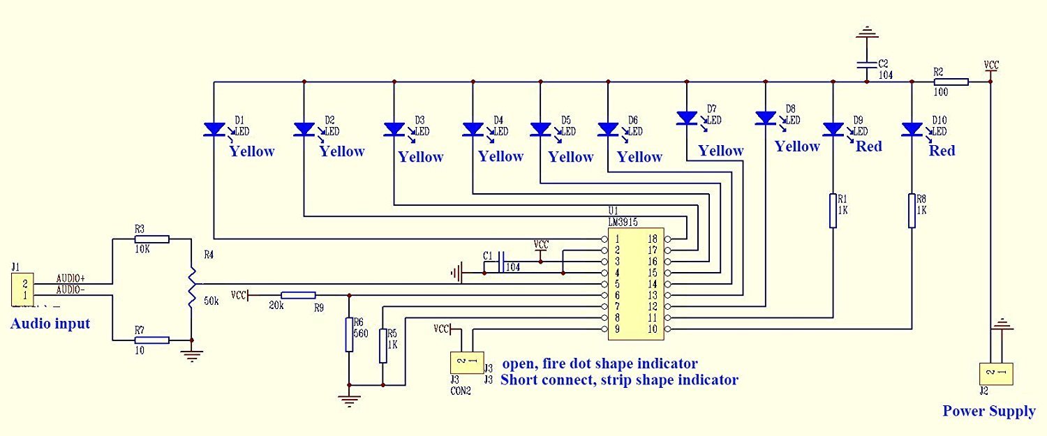 Схема индикатора звука на LM3915 представлена на фото.