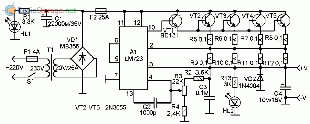 Постоянное напряжение на конденсаторе С1 на холостом ходу составляет 28V. Стабилизатор состоит из схемы стабилизатора на ИМС А1 и выходного регулятора напряжения на транзисторах VТ1-VТ5, мощные транзисторы VТ2-VТ5 которого включены параллельно.
