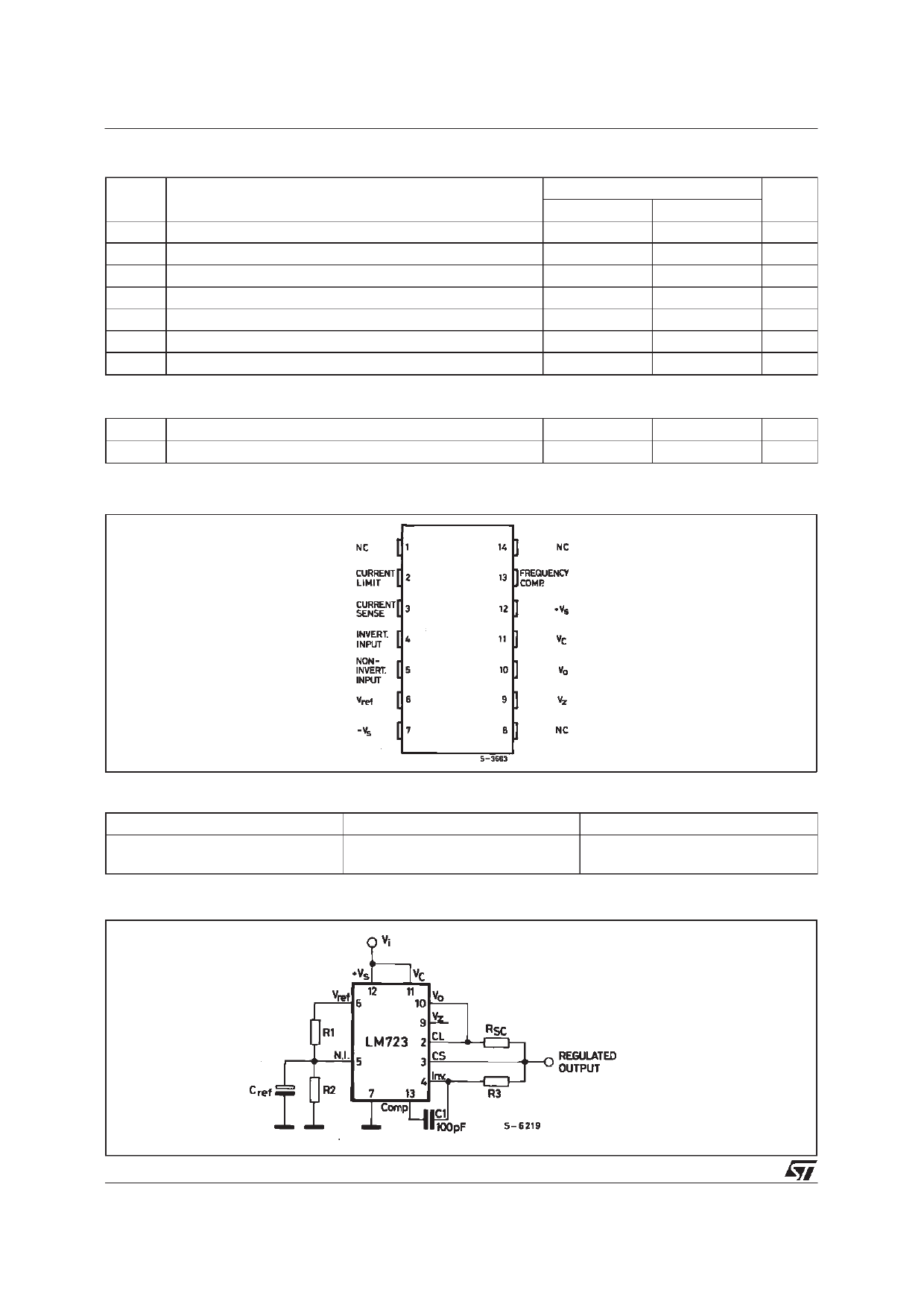 LM723 Vi ∆Vi-o Io Iref Top Tstg Tj DC Input Voltage Current from Vref Operating Temperature Rthj-a mb Thermal Resistance Junction-Ambient PIN CONNECTION (top views) Value oC oC oC Plastic DIP-14 o C /W ORDER CODES TEST CIRCUIT (pin configuration relative to the plastic package) SO-14 Vi = 12V Vo = 5V Io = 1mA R1/R2 ≤ 10KΩ 2/12