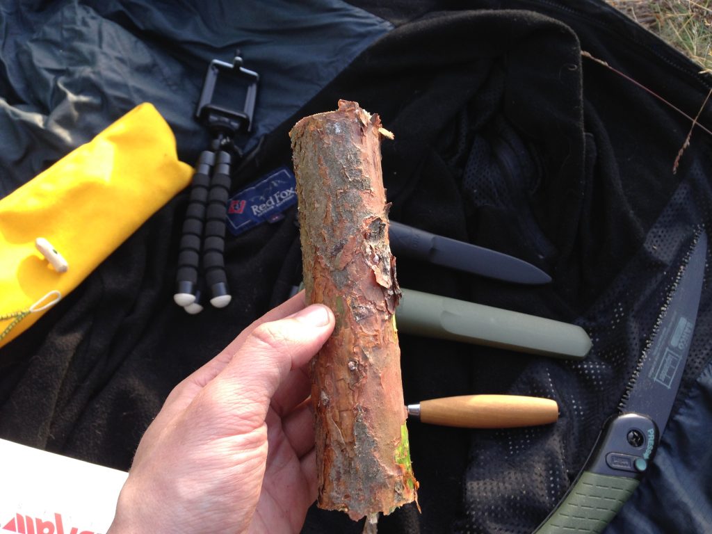 Не будем сразу пытаться делать большую ложку, давайте начнём с маленькой, длиной 15-17 см. Для этого нам потребуется брусочек соответствующей длины и диаметром 4-5 см. Отпиливаем его и снимаем кору с помощью ножа.