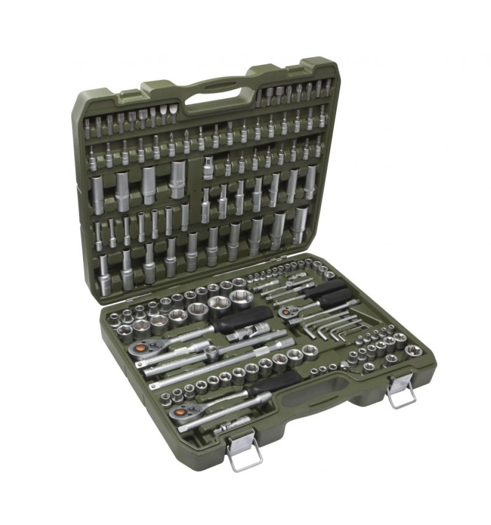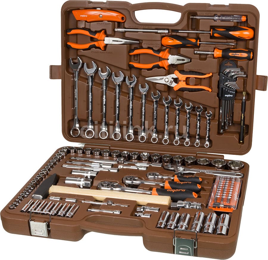 Этот набор такого же класса, что и Jonnesway, но только с большим количеством предметов (и цена соответственно несколько выше). Помимо комбинированных и разрезных ключей здесь дополнительно имеются имбусовые ключи под шестигранные головки. Они будут полезны не только для ремонта автомобиля, но и для сборки мебели. Помимо прочего в комплект входят пассатижи, 6 отверток под шлиц и шестигранник, одна отвертка-битодержатель для 26 бит и молоток. Как и в других наборах, здесь есть 4 воротка, включая удлиненный Г-образный для откручивания колесных болтов и других крепежей, требующих большого усилия.