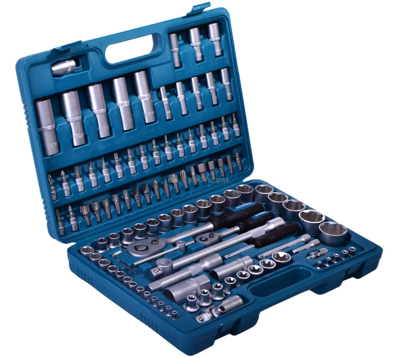 В чемоданчике имеется 43 шестигранных головки размером от 4 до 32 мм, а также 10 головок Е-профиль размером от 4 до 20 мм. Как и в других есть 2 свечных головки на 16 и 21 мм. Удлинителей здесь целых 8 включая гибкий. Особенностью набора являются приставные клещи, которыми можно зажать крепеж с одной стороны, чтобы открутить с другой. Все инструменты упакованы в удобный пластиковый кейс с металлическими застежками.