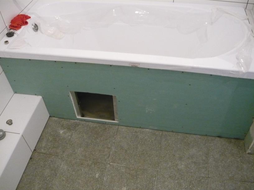 Готовый каркас зашивается выбранным листовым материалом с вырезанием отверстия под люк для доступа к сифону. Для этих целей обычно применяется влагостойкий гипсокартон или гипсоволоконные листы.