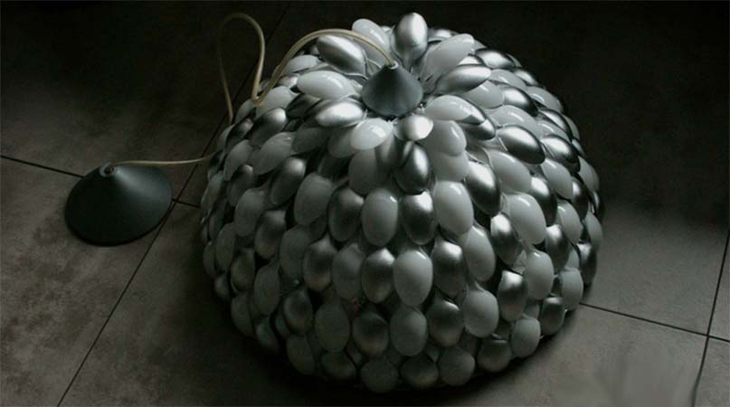 11. Еще один интересный дизайнерский ход – это сделать плафон из пластиковых, серебряных или алюминиевых ложек, скрепляя их между собой (заранее оторвать от них ручки). Такой плафон получится овальной формы и отлично будет смотреться на кухне с высокими потолками.