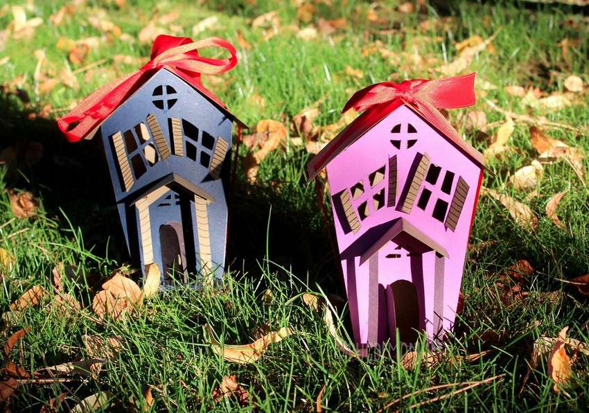 Объёмные домики могут быть разных видов и форм, как избушки, простые деревенские домики, многоэтажки и уникальные небоскрёбы. Использовать их можно в качестве домашних украшений или игрушек на ёлку, а если рассчитать пропорции, то и подсвечник получается красивым и оригинальным. Выбираются шаблоны, закупаются картон, бумага, клей, скрепки, что в итоге превращается в целый город или посёлок с заборчиками, садами и огородами.