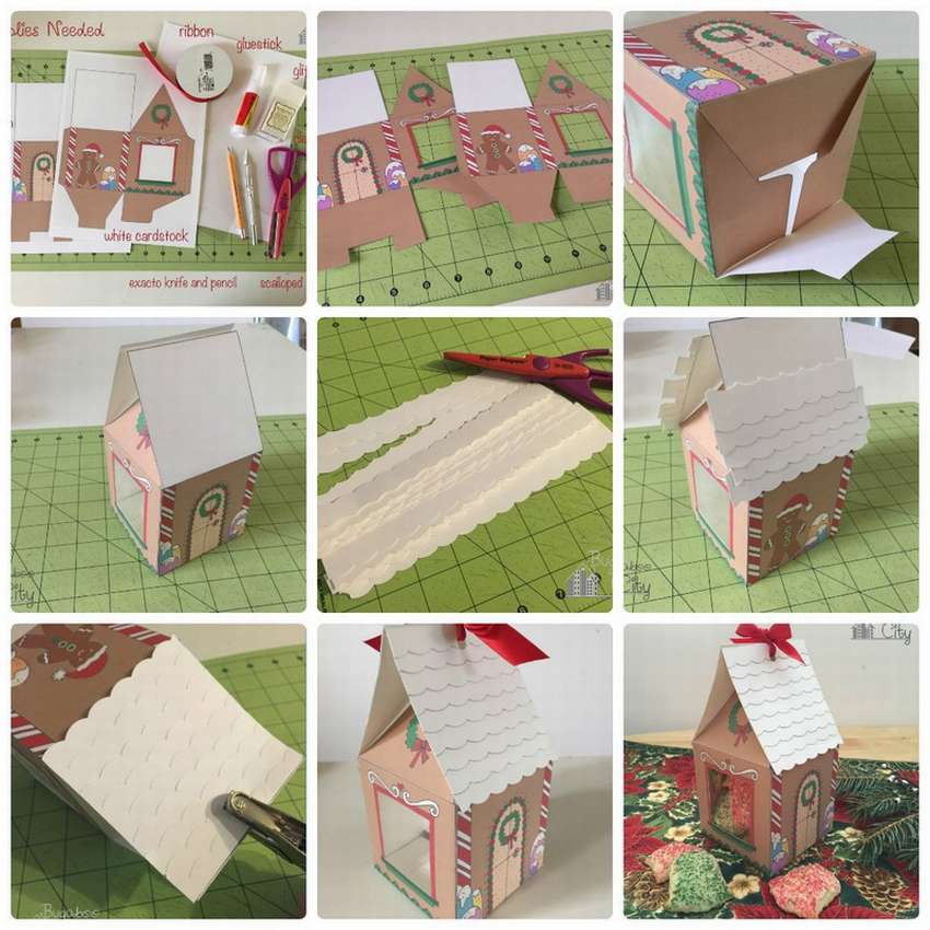 Вот еще два примера, как сделать пряничный домик из бумаги своими руками. Во-первых, не забудьте набрать линии сгиба, сильно нажимая карандашом, когда будете рисовать. Сложите все линии сгиба. Вырежьте окна ножницами с острыми концами или ножом Xacto. Склейте стены. Чтобы приклеить крышу, начните с нанесения горячего клея на выступ одной из боковых стенок, а затем поставьте крышу на место. Поднимите другую сторону крыши, затем быстро нанесите клей на остальные выступы и прижмите крышу вниз. Вот и все, если коротко. Второй пример тоже представляет собой отличный проект, который дети могут украсить наклейками, гелевыми, узорной бумагой, помпонами, блестками — все, что душе угодно! Вы можете покрыть пряничный домик из бумаги войлоком и добавить симпатичные конфеты. Но обрезка, это определенно работа взрослого. Основной материал для этого проекта — гофрированный картон. Этот проект очень простой, если сделан так, что картон изгибается в направлении гофра. Сделайте линии надрезов таким образом, чтобы они были в одном направлении гофра (параллельные ребра или канавки). Как сделать бумажный домик своими руками, детально показано на пошаговых фото.