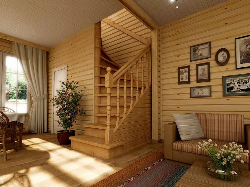 Что касается отделки, то она преимущественно деревянная. Особенность – в чередовании темной облицовки со светлой, включая потолочную поверхность.