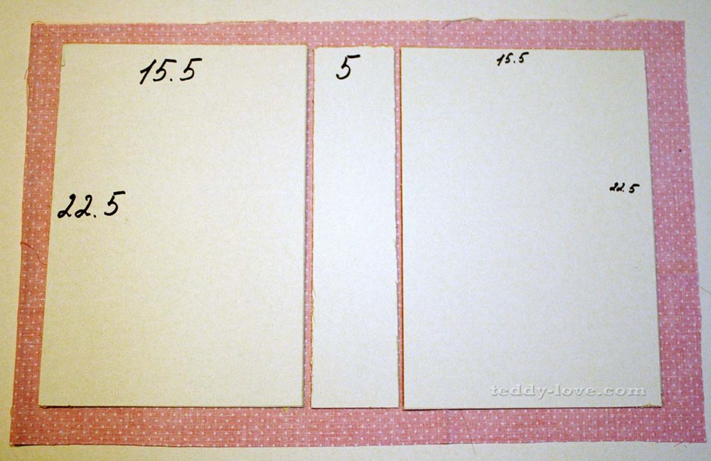 - На внутреннюю часть верхней и боковой части приклеиваем декоративную бумагу размером 22х23 см. Аккуратно прочерчиваем линии сгиба каким-либо острым предметом (не пишущей ручкой или ножичком для пластилина).