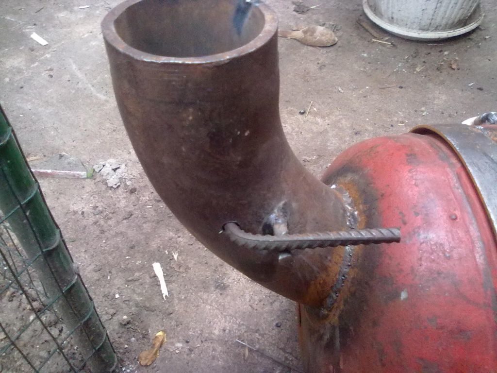 - для отвода продуктов горения необходимо приварить патрубок с коленом;
