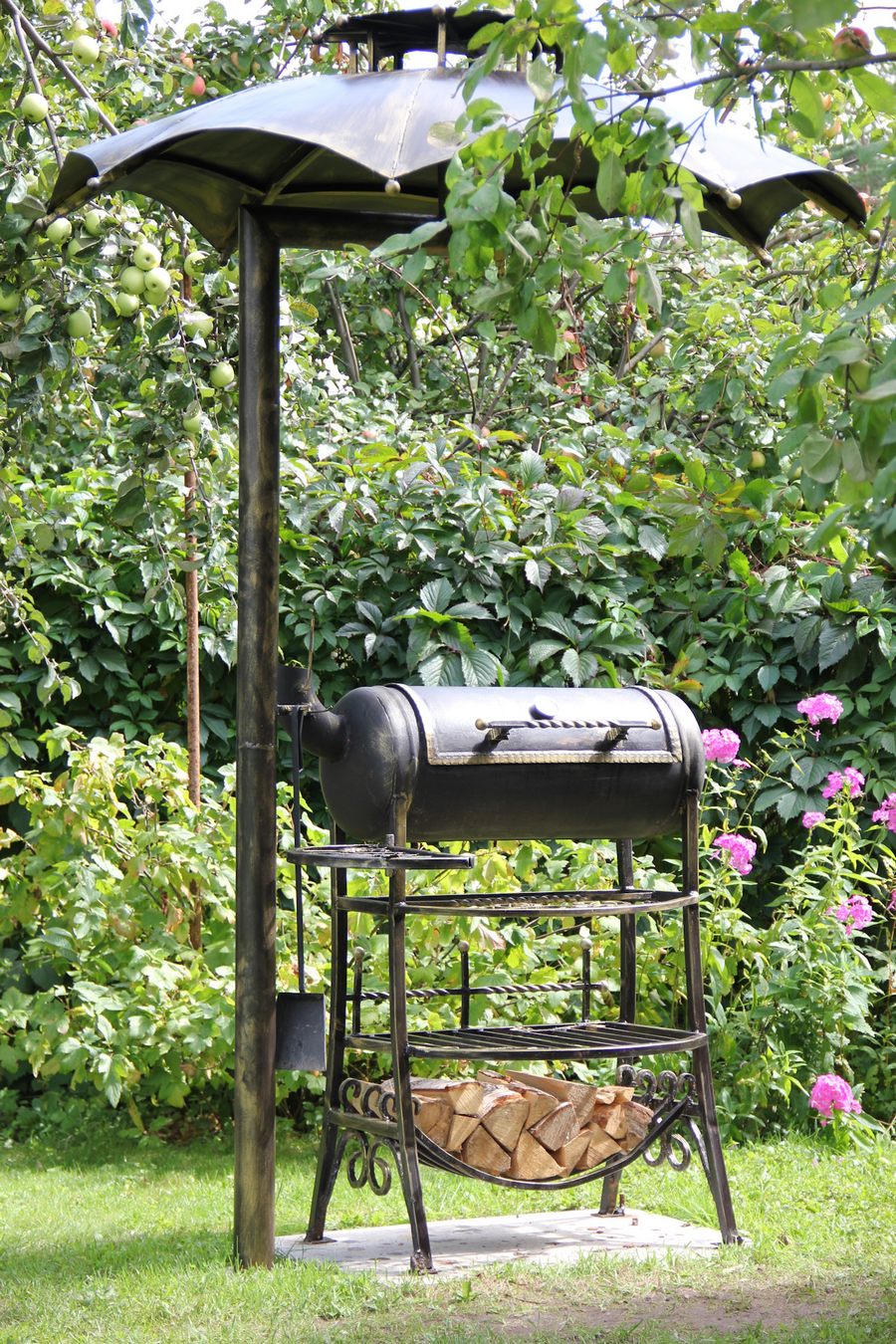Стационарную барбекюшницу, как правило, монтируют на фундамент из бетона или кирпича. Кроме того, конструкцию можно стилизовать — например, приварить кованые колеса, чтобы придать мангалу вид паровоза.