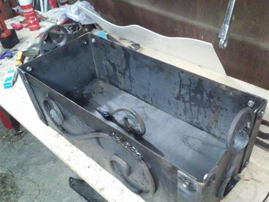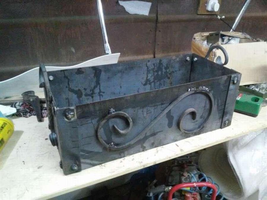 Крышку выполняют также из цельного отрезка листовой стали: его прикладывают к бортику, чтобы сделать отметку керном, и здесь оставляют припуск 1 см по всем сторонам, для загиба нужно будет еще по 3 см. Согласно полученной разметке выпиливают прямоугольную заготовку. В углах вырезают пространство для сгиба 3х3 см, края подгибают и сваривают образовавшиеся стыки. Крышку оснащают ручкой и предусматривают стопоры, позволяющие зафиксировать конструкцию в приподнятом состоянии.