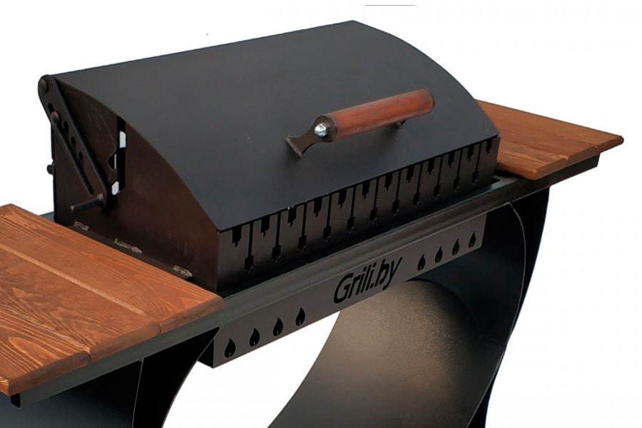 В складных моделях откидная полка в закрытом состоянии выполняют функцию крышки. В открытом — крышка превращается в удобную боковую полку. На ней можно разместить принадлежности для жарки — щипцы, опахало, миску с соусом, бутылку с вином для сбрызгивания мяса и т.д.