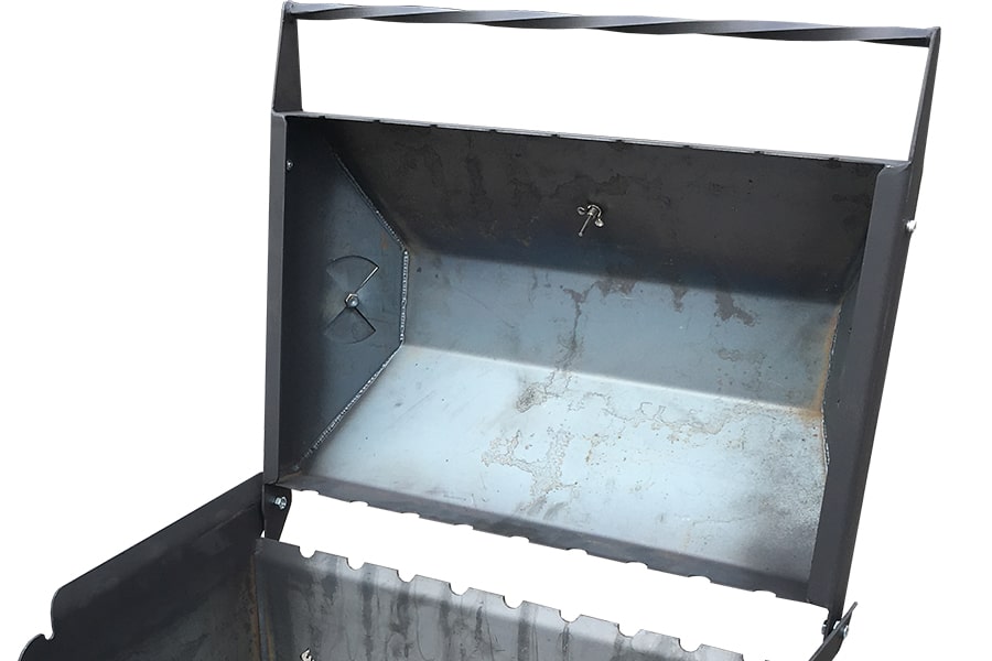 Обычно мангалы с крышкой являются цельносварными, и разобрать их для тщательной очистки от золы и угольной пыли не получится. Зольник позволяет решить эту проблему. После жарки мяса, рыбы или овощей достаточно будет вытащить ящик и выбросить золу с пеплом.