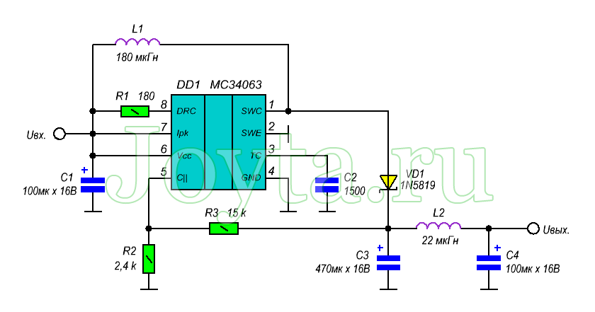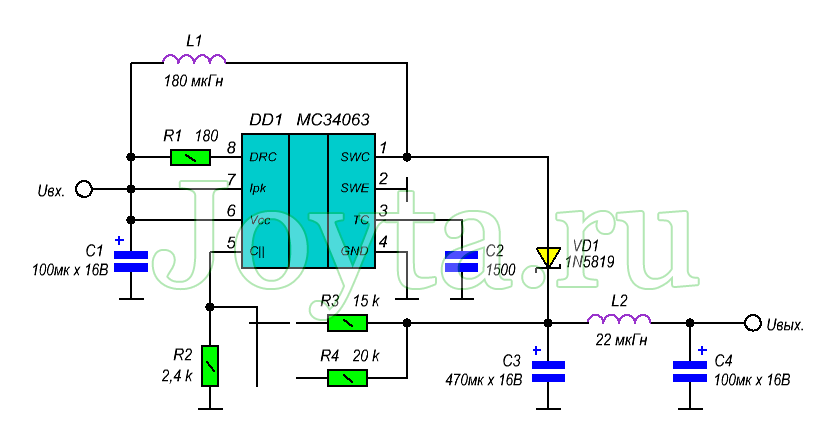 За основу схемы взята специализированная микросхема MC34063 (ее российский аналог К1156ЕУ5). Преобразователь напряжения MC34063 представляет собой электронную схему управления DC / DC — преобразователем.