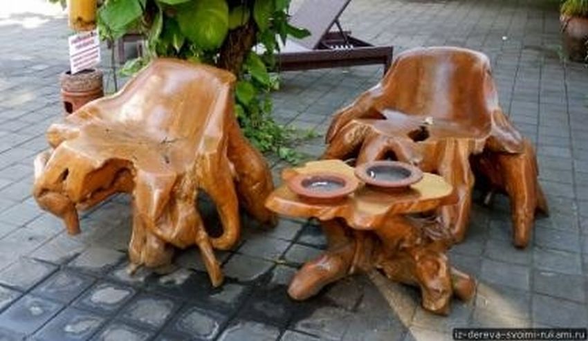 Самый обычной вариант таковой фурнитуры – пни и различные по размеру колоды. Спилите ровненьким срезом пень – и стол со стульями вполне готовы делать свои прямые функции!