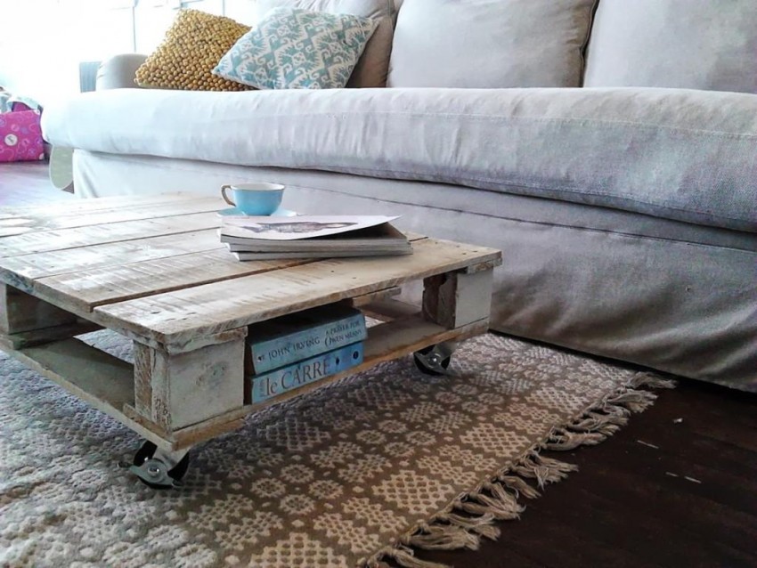 Для изготовления журнального столика понадобится всего 1 паллет. Дополнительно обязательно нужно купить колёсики, так конструкция будет более мобильной. После предварительной обработки приступаем к выполнению основного этапа: