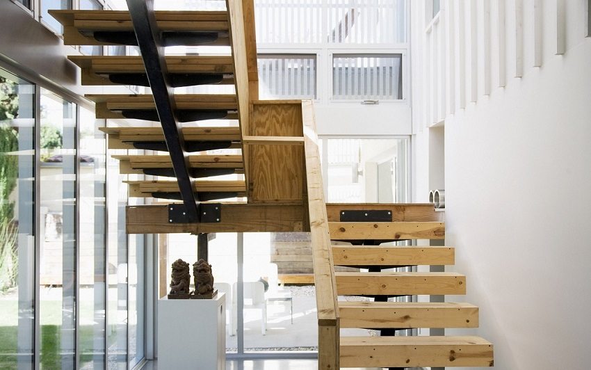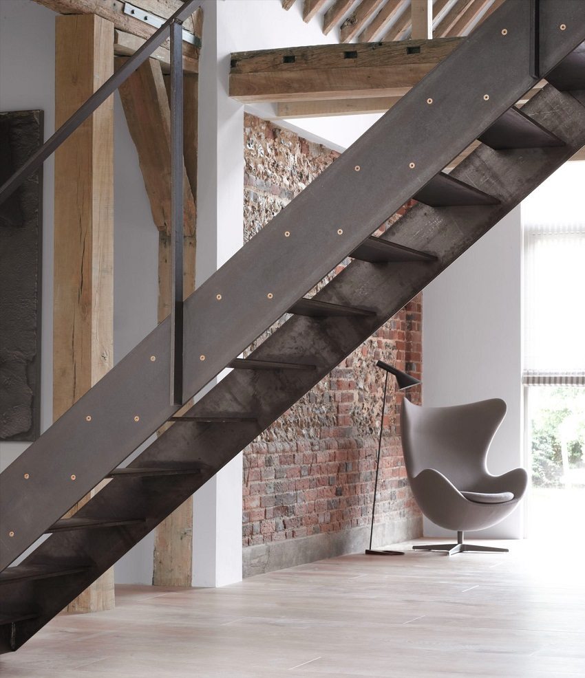 Лестница на второй этаж в частном доме на металлическом каркасе обладает следующим рядом преимуществ: