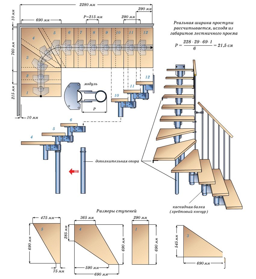 — Количество пролетов; — Значение угла уклона, которое не меняется для каждого пролета. Их количество значения не имеет, главное – единство показателя; — Высоту пролета; — Характеристики ступенек: ширину, количество, высоту; — Способ соединения при наличии минимум двух пролетов (забежные ступеньки или площадку); — Габариты проема под лестницу.