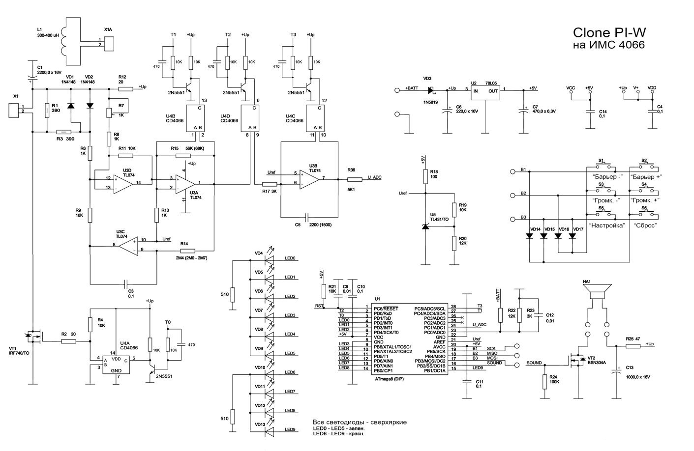 По сути, это удешевленный вариант профессионального искателя Clone PI-AVR, только вместо ЖК дисплея применяется линейка светодиодов. Это не так удобно, но по-прежнему позволяет контролировать глубину залегания артефактов.
